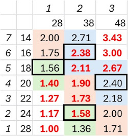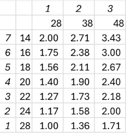 After watching this video, I went out and counted the teeth on each of the sprockets. The front crank had teeth counts of 28, 38, and 48. The rear “cassette” sprockets had teeth counts of 14, 16, 18, 20, 22, 24, and 28. These teeth counts, when charted like shown in the video, produce the following values: