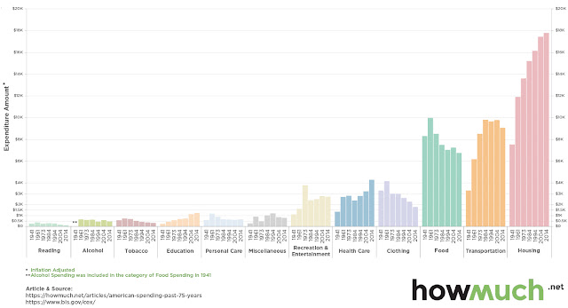 There are numerous studies on how Americans spend their income as a percentage of their pay. A common claim is that households spend approximately 75% of their income in only 4 areas: Housing, Transportation, Food, and Clothing. The following chart which shows spending by category over the 73-year period of 1941-2014 does show how these…
